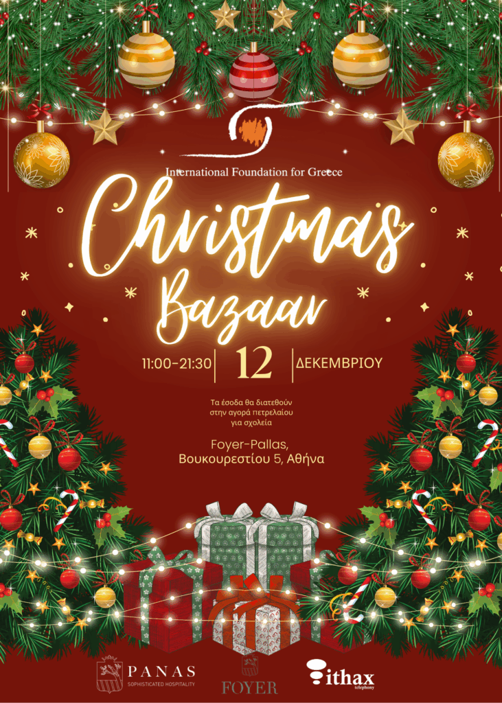 The International Foundation for Greece (IFG) is organizing a Christmas Charity Bazaar on Thursday, December 12, 2024 in the foyer of the Pallas Theater, 5 Voukourestiou Street.